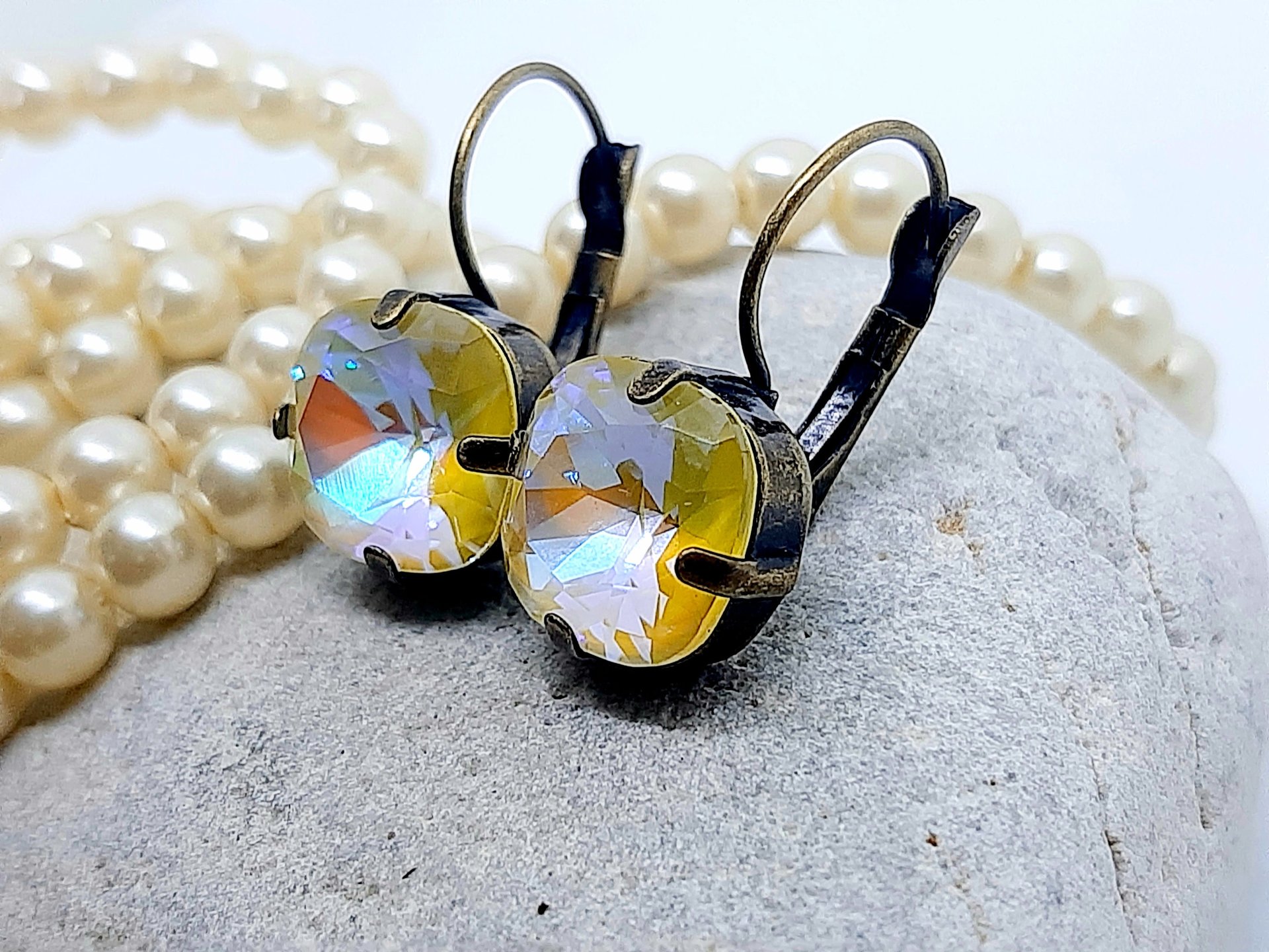 Yellow Sunflower Delight Cushio Crystal Earrings in Antique Bronze. Austrian Fancy Cushion Crystals.